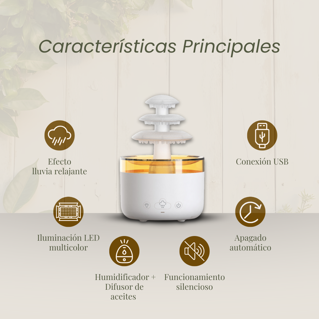 Ideal para dormitorios, oficinas, salas de estar o espacios de meditación. Su efecto lluvia y luz ambiental te ayudan a desconectar del ruido y reconectar contigo mismo.